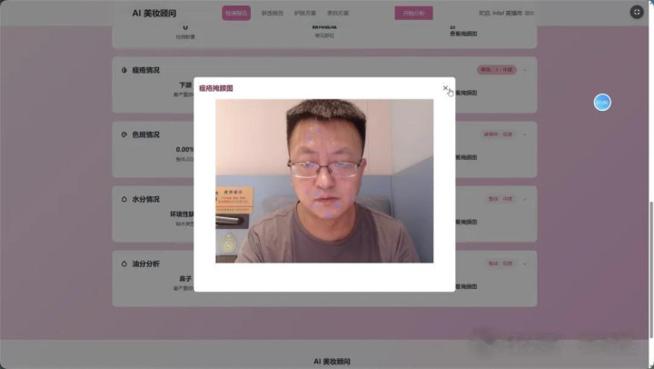 并且点击查看掩膜图,还会弹出一张标出具体皮肤问题位置的照片,例如痤疮就出现在下图中蓝圈的地方: